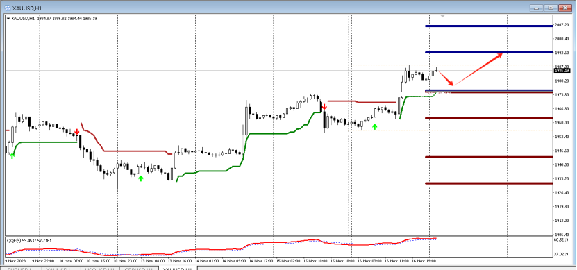 目前QE箭头向上,代表多头强劲,预示行情向上的概率大,故而可以采取低多的策略,可以在15分钟寻找做多信号,第一压力位置:2006.00。下方第一支撑1960.00