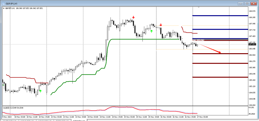 目前QE箭头向下,代表空头强劲,预示行情向下的概率大,故而可以采取高空的策略,可以在15分钟寻找做空信号,第一压力位置:187.72。下方第一支撑186.65