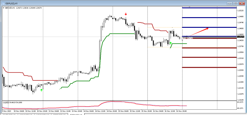 目前QE箭头向上,代表多头强劲,预示行情向上的概率大,故而可以采取低多的策略,可以在15分钟寻找做多信号,第一压力位置:1.2500。下方第一支撑1.2330