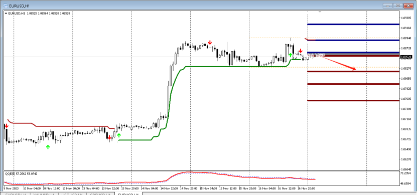 目前QE箭头向下,代表空头强劲,预示行情向下的概率大,故而可以采取高空的策略,可以在15分钟寻找做空信号,第一压力位置:1.0920。下方第一支撑1.0800