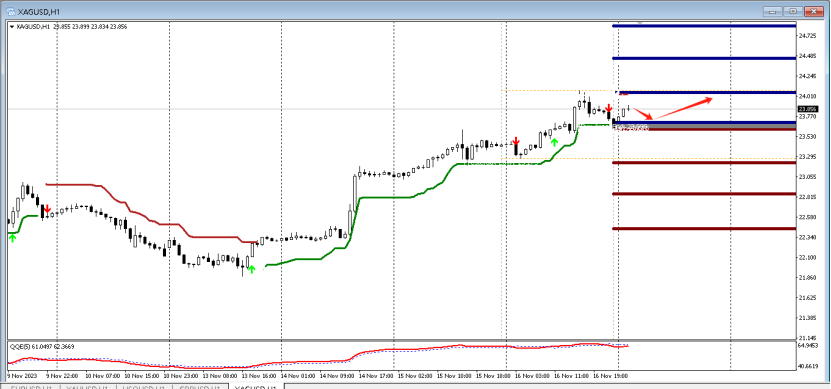 目前QE箭头向下,代表空头强劲,预示行情向下的概率大,故而可以采取高空的策略,可以在15分钟寻找做空信号,第一压力位置:24.43。下方第一支撑23.21