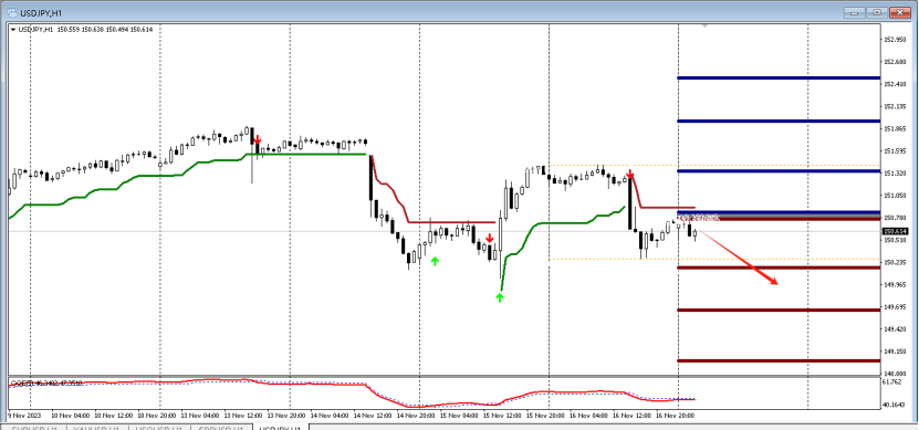 目前QE箭头向下,代表空头强劲,预示行情向下的概率大,故而可以采取高空的策略,可以在15分钟寻找做空信号,第一压力位置:151.38。下方第一支撑149.65