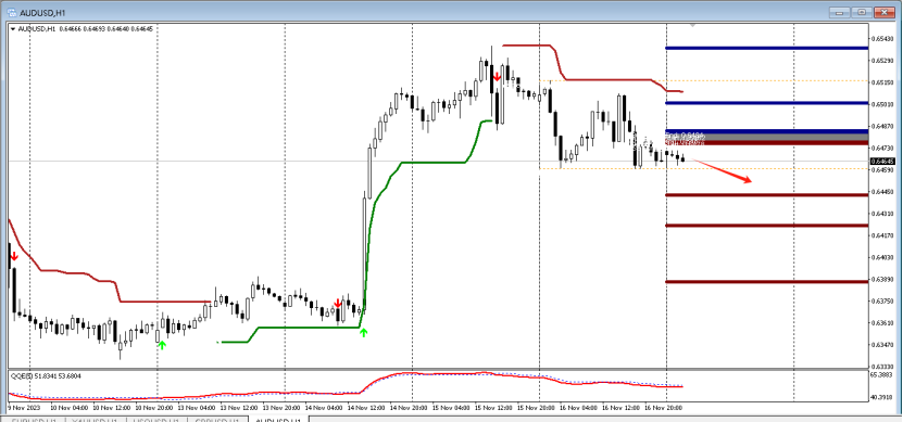 目前QE箭头向下,代表空头强劲,预示行情向下的概率大,故而可以采取高空的策略,可以在15分钟寻找做空信号,第一压力位置:0.6536。下方第一支撑0.6422