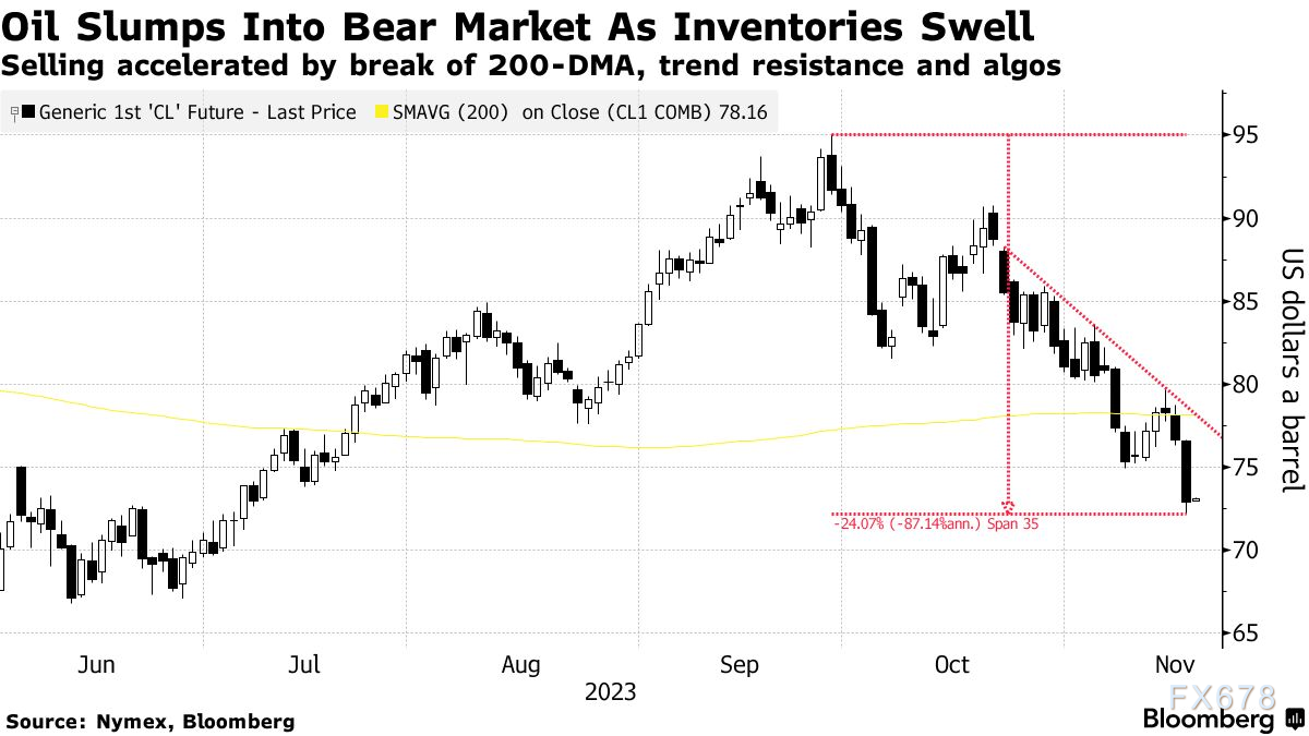 与此同时,石油继续陷入熊市区域,交易价格约为每桶73美元。趋势跟踪交易加速了由库存增加和关键技术支撑水平失守引发的损失。