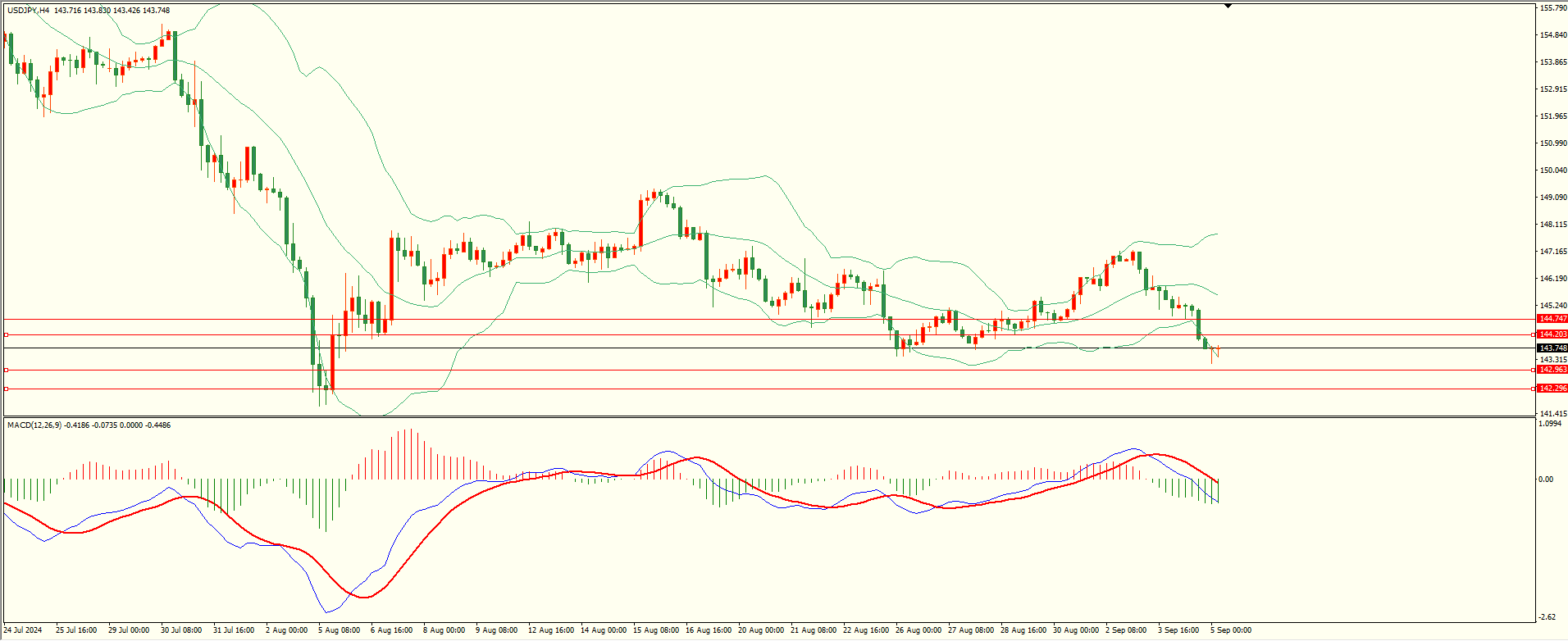 美日昨日小幅反弹后承压下行,至收盘续创日内新低,日线报收中阴线,目前下方紧邻前低支撑区,下破后方可打开下行空间,从4H来看,布林上下轨略有扩张,MACD零轴附近运行,日内上方首要阻力144.20-30,第二阻力144.75,下方支撑142.95,142.30,保持在第一阻力下方短线有望测试第一支撑。
