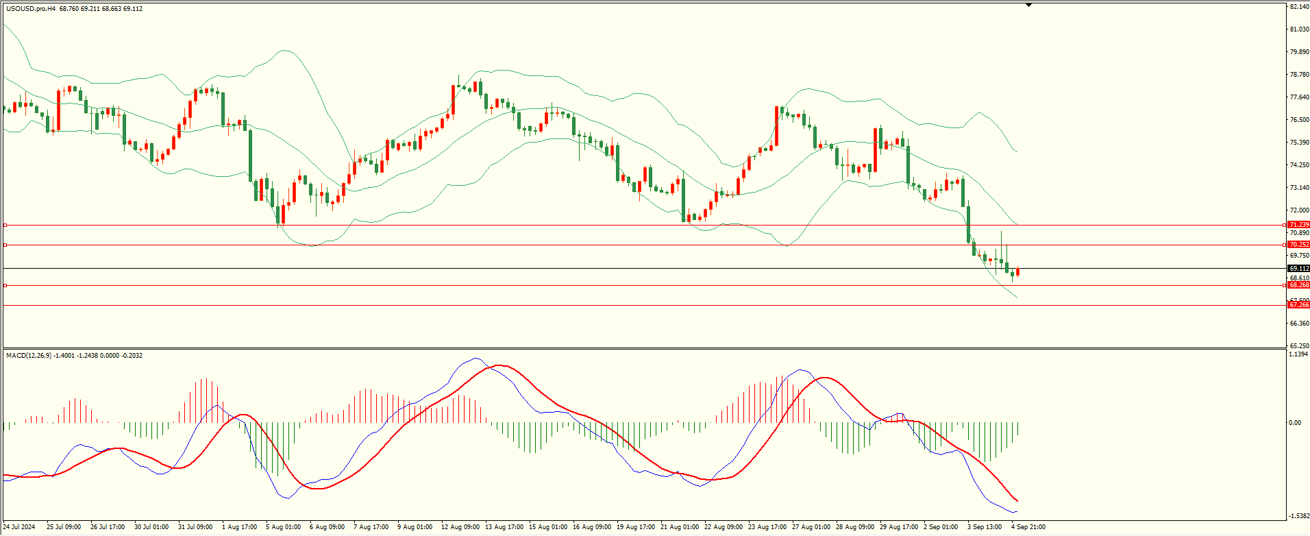 原油昨日反弹至第一阻力上方延续走低,至收盘踧踖第一支撑跌势缓和,日线报收上下影线中阴线,空头格局保持,从4H来看,布林中轨偏下,MACD零轴下方运行,日内上方首要阻力70.25,第二阻力71.20-30,下方支撑68.25,第二支撑67.25,保持在第一阻力下方短线有望回测第一支撑。