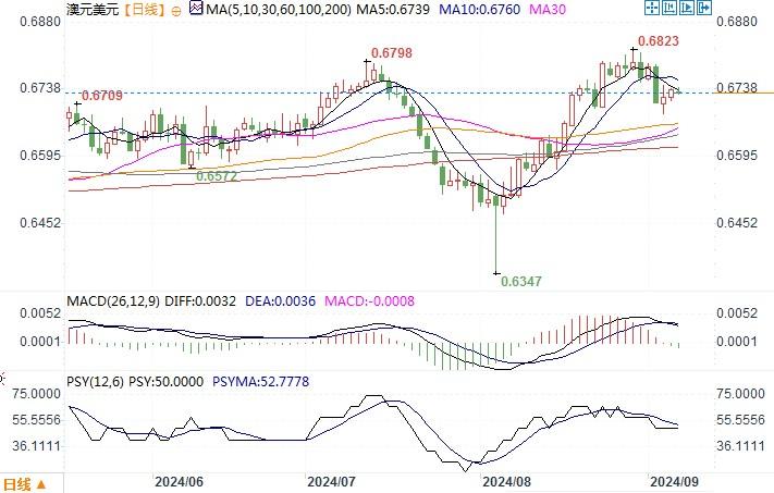 周四(9月5日),澳元兑美元扭转了早些时候的跌势,当日上涨0.1%,收盘于0.6740。尽管经济数据疲软,澳洲央行仍坚持鹰派利率指引,帮助抵消了全球市场的避险情绪。澳洲央行总裁布洛克(Michele Bullock)在一场演说中重申,鉴于通胀压力顽固,短期内不太可能降息。她还淡化了显示6月季度经济几乎不见增长的数据,表示需求的水平仍然领先于供应。汇丰银行澳洲经济部主管Paul Bloxham表示,“供应侧受到压抑意味着尽管GDP增长疲软,但通胀仍然过高。我们的主要看法点是澳洲央行将在整个2024年按兵不动,要到2025年第二季度才可能开始降息。”澳洲央行下一次会议将于9月24日举行,但市场认为届时几乎不可能放松政策。稳定政策的前景帮助澳元/美元守住了0.671水平。日线图上,澳元/美元险受于布林带通道中轨线之上,但技术指标方面仍显示澳元下行的趋向性风险未解除。若反弹高度上不能受限于0.6760之下,则当心澳元有重归下行的风险。下方的关键支撑在0.6684,一旦跌穿,下行空间将会扩大。