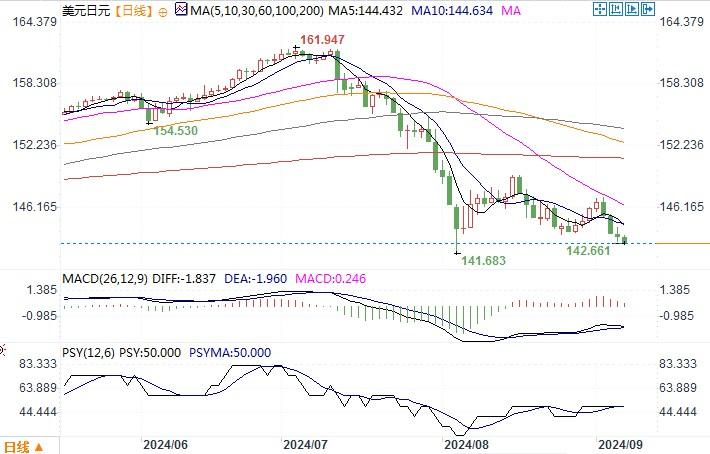 周四(9月5日),美元兑日元跌0.3%报143.35,创了一个月新低。避险需求和对日本央行即将加息的预期在最近几个交易日帮助提振了日元。周四的数据显示,由于裁员人数仍然较少,上周美国初请失业金人数有所下降。初请失业金报告有助于缓解人们对劳动力市场正在恶化的担忧。虽然如此,美元并未因此得到任何支撑反而转跌。这主要是市场对于美联储9月降息的预期无减,现在每次数据的公布只关乎到底是减25个基点还是50个基点的问题。在笃定美联储9月份将会降息的预期氛围下,美元似乎难以找到支持其走强的因素。目前市场目光将放在周五即将公布的非农数据上,接受路透访查的经济学家预计,8月份美国非农就业岗位将增加16.5万个,高于7月份的11.4万个。如果数据符合预期,或能暂时缓和美元下跌势头。而一旦数据结果低于预期,预料美元走低风险将会增高。日线图上,美元/日元继续沿布林带通道下轨线运行,但下跌幅度有所减小,各项技术指标暂时也未显转向痕迹,该货币对仍处于区间震荡走势之中。若进一步下行,首要测试目标将是8月份低点141.65,破位后将会进一步扩大下行的空间。上方只有冲破150,或许才会发生另一段的回升行情。
