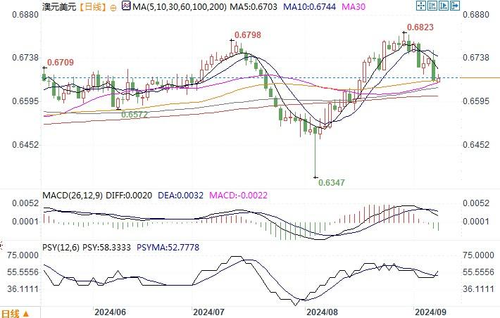 中国银行广东省分行王刚称,周五美日下跌0.7%收盘于142.27连续第四个交易日下跌,盘中最低触及141.77。美国8月非农数据不及预期,美元高利率周期即将有望逆转日元相应的刺激。而且日本央行近期对于加息持鹰派的态度,亦是给到日元回升不小的助力。美国经济担忧加剧风险偏好情绪受较大打击,加上大宗商品价格周线大幅下降,对澳元也构成压力。日元强力回升,对澳元亦是产生不小的冲击。
