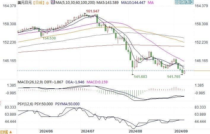 周五(9月6日),美元兑日元下跌0.7%收盘于142.27连续第四个交易日下跌,盘中最低触及141.77。美国劳劳工统计局周五表示,上个月非农就业岗位增加了14.2万个,而7月份的增幅被向下修正为8.9万个。接受路透调查的经济学家此前预计,8月份就业岗位将增加16万个。此前的报告称7月份增加了11.4万个就业岗位。道明证券美国利率策略主管Gennadiy Goldberg 说:“我认为市场真的纠结于这份报告,因为它确实既可被用作降息25个基点的理由,也可被用作降息50个基点的理由。”多伦多支付公司Corpay的首席市场策略师Karl Schamotta说:“美国经济在未来几个月似乎更有可能滑出轨道,这证明美联储官员有理由做出越来越激进的回应。”他说:“联储在 9 月份的会议上降息50个基点的可能性仍然不大,但今天公布的数据提供了劳动力市场基本面急剧恶化的明确证据,并将增强对未来几个月至少一次巨幅降息的押注。”美联储政策制定者周五暗示,他们已准备好在两周后的会议上启动一系列降息措施,并指出劳动力市场降温,如果不改变政策,可能会加速恶化。美元高利率周期即将有望逆转的市场变化,给到日元相应的刺激。而且日本央行近期对于加息持鹰派的态度,亦是给到日元回升不小的助力。日线图上,美元/日元再度来到8月份的低点附近。图形上是形成双底还是能进一步向下突破,有待观察。短线须防超卖调整风险。