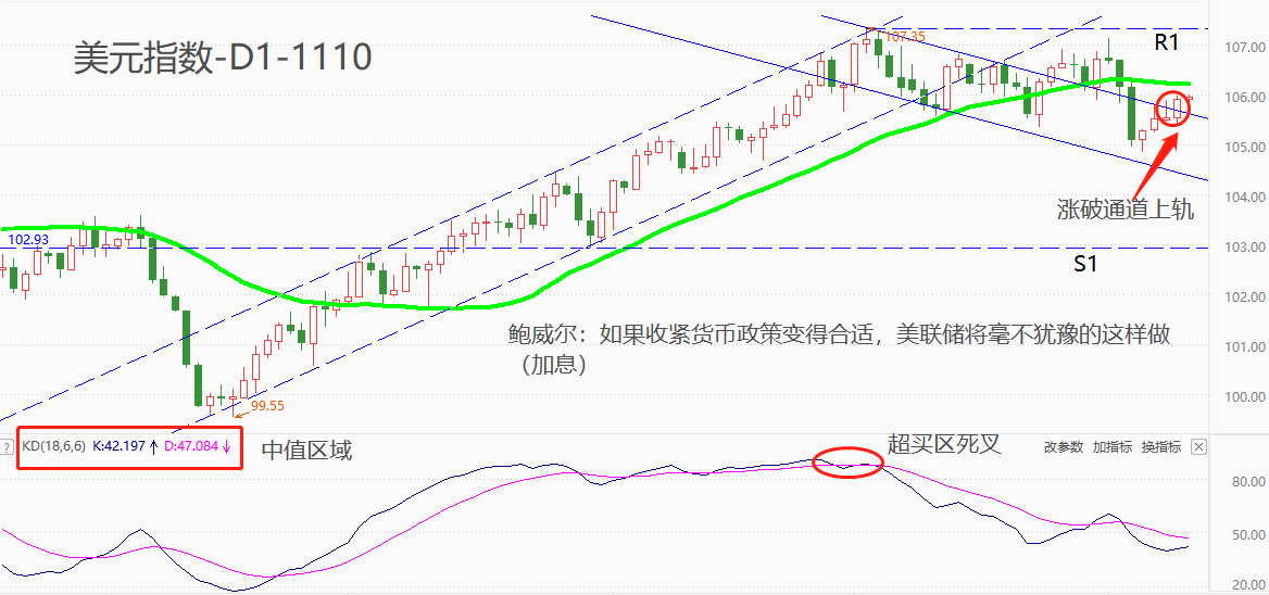 ATFX汇市:11月10日,美联储主席鲍威尔在IMF举办的专家小组会议上讲话称:“如果进一步收紧货币政策变得合适,美联储‘将毫不犹豫地’这样做。”他还提到,对目前通胀进展感到满意,但“还有很长的路要走”。鲍威尔的讲话削弱了此前因为三次连续暂停加息而产生的宽松货币政策预期,加强了美联储维持限制性高利率政策的预期。美元指数受到显著提振,昨日上涨0.35%,最高触及105.97,距离106关口仅一步之遥。