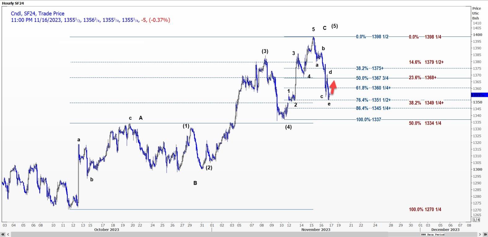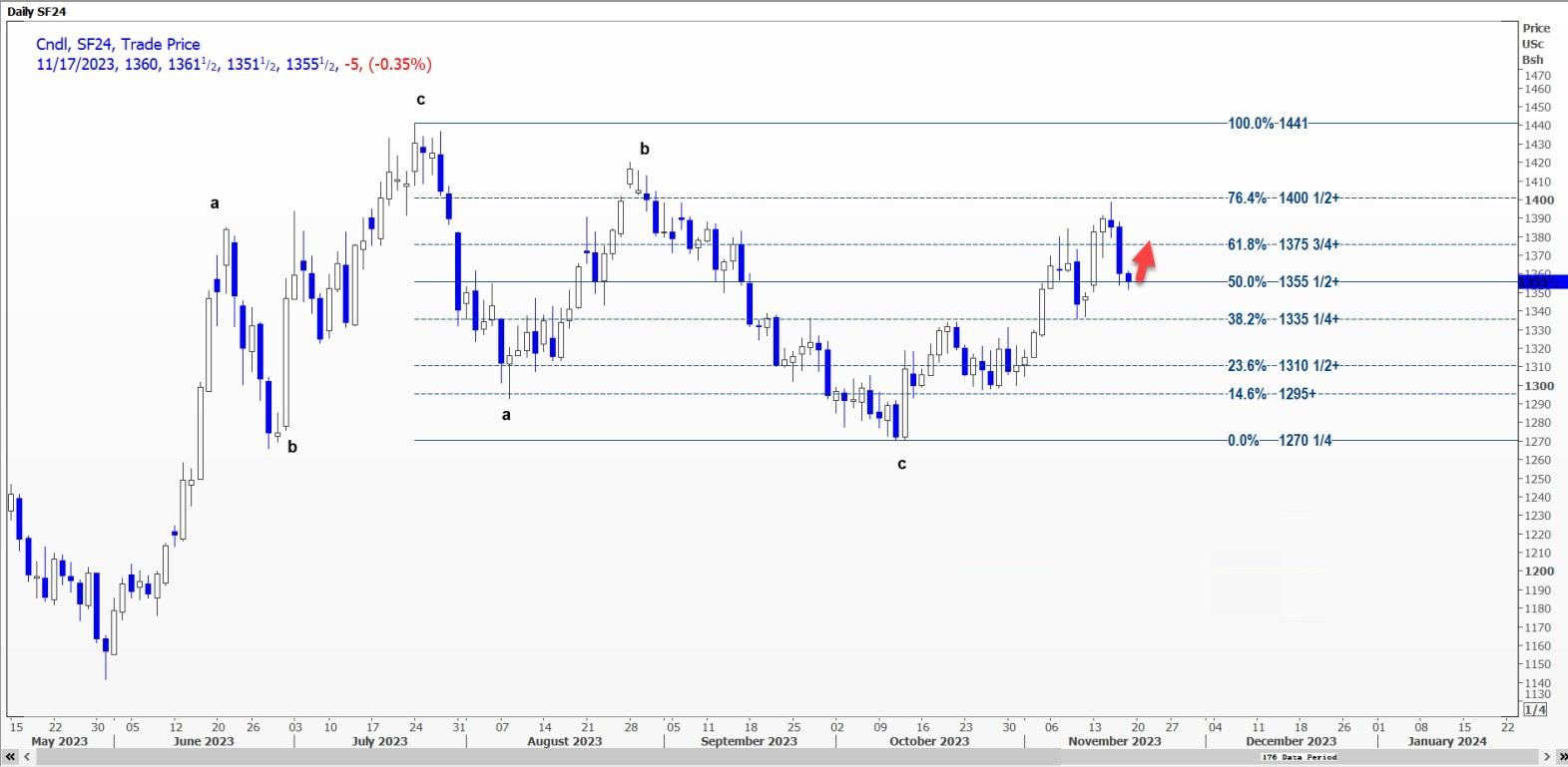 CBOT大豆1月合约SF24可能徘徊在每蒲式耳1351.5美分的支撑位上方,或反弹至1360.25美分至1367.75美分的区间。