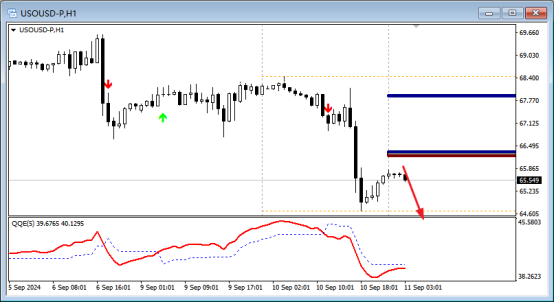 目前QE箭头向下,代表空头强劲,预示行情向下的概率大,故而可以采取高空的策略,可以在15分钟寻找做空信号,第一压力位置:66.3。