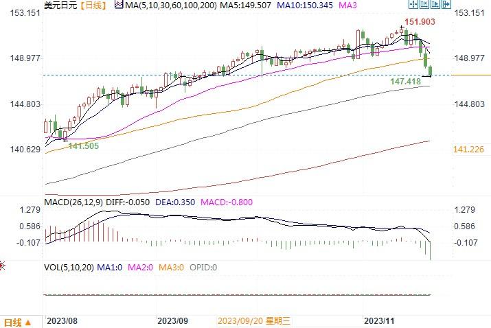 周一(11月20日),美元指数跌至两个多月来最低,延续了前一周的跌势,美元/日元触及六周半低点的148.09。周一,世企研(世界大型企业研究会)公布其美国10月领先指标下降0.8%,这是连续第19个月下降,预期为下降0.7%。最近从美国公布的经济数来看,经济增长势头有所下降,通胀率更是有明显的回落趋向。虽然美联储至今仍坚持对继续加息敞开大门的态度,但市场上早已经排除了美联储再次加息的可能性,甚至开始试图确定美联储何时开始降息。根据芝商所(CME)的FedWatch工具,目前市场预计美联储在明年5月前降息至少25个基点的可能性超过50%。市场上的这种利率走向预期,料将进一步拖低美债收益率水平。而美元与日元之间利率差水平则有望逐渐收缩,此前那种融入低廉日元转套美元的交易模式恐怕也有望得以转变。日线图上,美元/日元隔夜市场上跌穿了昨日提到过的颈线支撑,而且连续三个交易日拉出长阴柱体,显示美元/日元回落势头较为猛烈。各项技术指标亦呈明显的下摆趋向。预计美元兑日元仍会延续着下行的趋向。