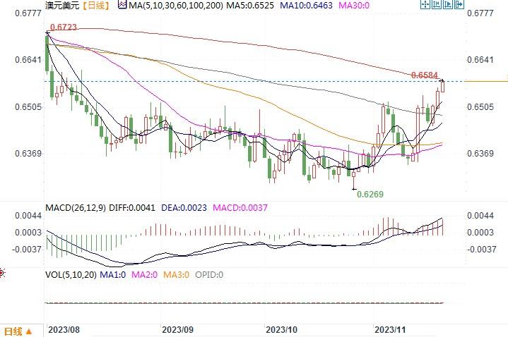 周一(11月20日),澳元/美元上涨0.6% 至三个月高点0.6555 美元,延续了上周2.4%的大幅涨势。因投资者押注美国利率已见顶,美元在周一的亚洲交易时段遭到强烈的抛售,人民币兑美元中间价周一报7.1612元,创8月11日以来新高,在岸人民币升幅超过0.3%。这给已经从温和美国通胀报告中受益的澳元带来进一步提振(澳洲经济对中国市场的依赖度较高,澳元经常被视为人民币的流动替代货币。因此澳元与人民币的走势往往有着较高的关联度)。日线图上5、10和21日均线呈看涨排列,各项技术指标上摆倾向明显,显示澳元/美元上冲动能较足。若进一步上行,澳元/美元阻力位在7月/10月跌幅的50%回档位0.6583, 关键阻力位在200日均线0.6592,突破将继续看涨。支撑位在0.6448,跌破则表明此轮反弹将告一段落。