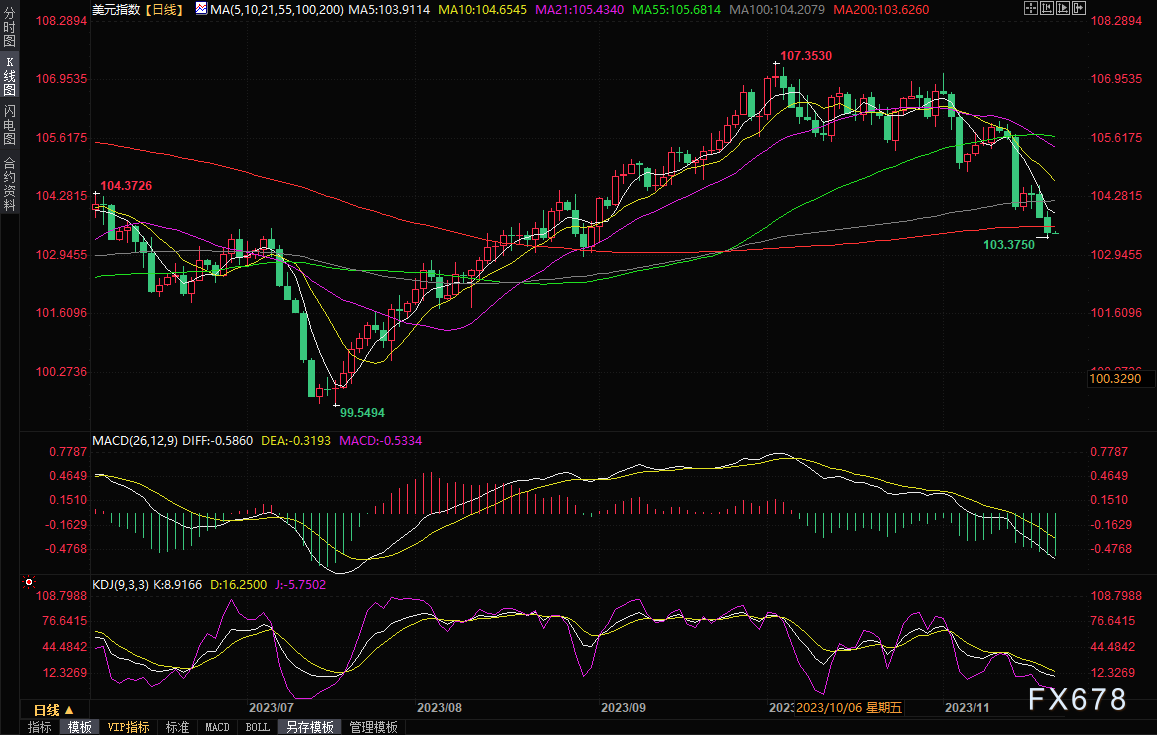 周一(11月20日),美元指数跌至过去2个月来的最低水平,最低至103.36,同时根据近期经济发展发出看跌信号。