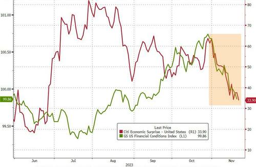 也许最值得注意的是,自从美联储强调市场“正在履行其职责”(通过收紧金融环境)以来,美国宏观经济数据接连令人失望,金融环境大幅宽松……