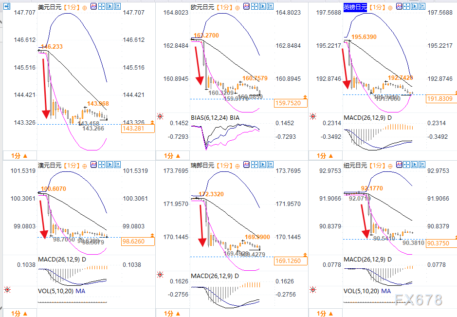 日元交叉盘也有类似跌幅。英镑兑日元2分钟暴跌340点至196.20下方。欧元兑日元2分钟内暴跌290点至160.30一线,澳元兑日元2分钟暴跌180点至98.70,瑞郎兑日元2分钟暴跌160点至169.60附近,纽元兑日元2分钟暴跌约160点至90.50一线。在此暴跌之后,市场陷入短暂整理,然后延续跌势。