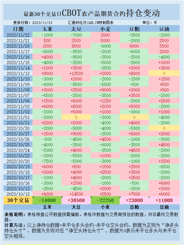 交易商估算的结果显示,大宗商品基金本周三(11月22日)增加小麦投机性净多头头寸,增加玉米、大豆、豆油、豆粕投机性净空头头寸。最近30个交易日,大宗商品基金本增加玉米、小麦投机性净空头头寸,增加豆粕、大豆、豆油投机性净多头头寸。