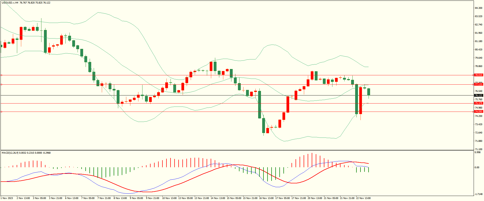 原油昨日表现较为震荡,亚市开盘后继续走低,纽约盘时段触及前支撑再次展开反弹,日线报收上下影线中阴线,上方阻力犹存,短线略有偏空,从4H来看,布林中轨略有拐头,MACD零轴附近运行,日内上方首要阻力77.10,第二阻力78.00,下方支撑75.35,74.50-60,保持在第一阻力下方短线有望回测第一支撑,谨防震荡反复。