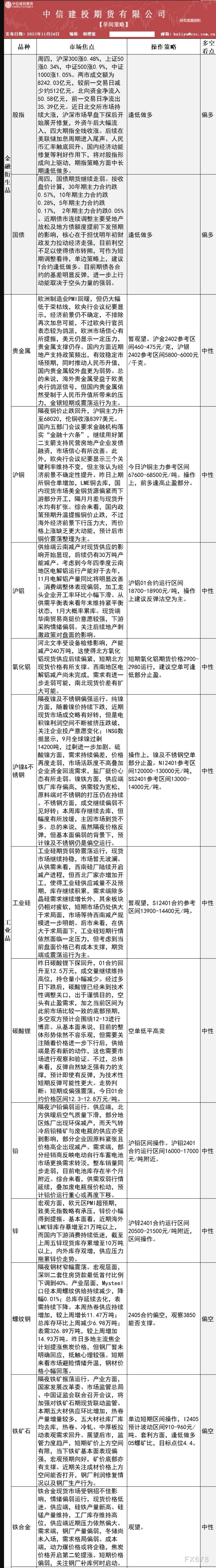 以下为中信建投期货11月24日对股指、国债、贵金属、能源化工、黑色建材、有色金属、农产品期货交易提醒和建议。