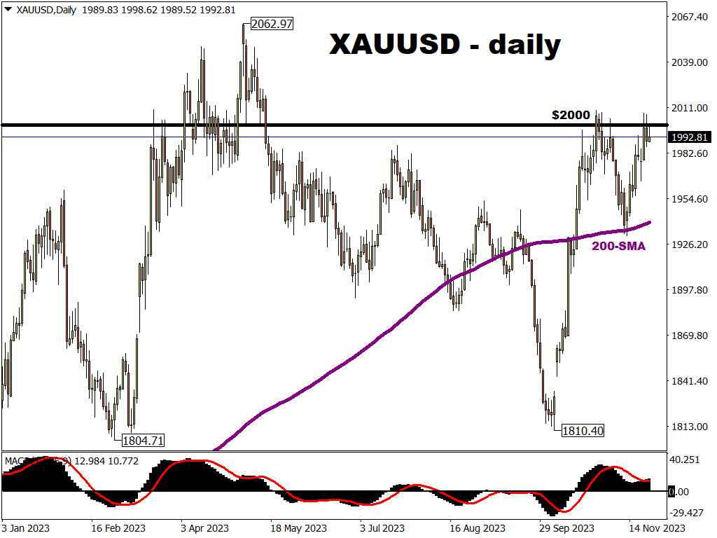 由于市场押注美联储将在2024年比之前预期更快地降低利率,金价现在再次触及2000美元这一重要心理关口。