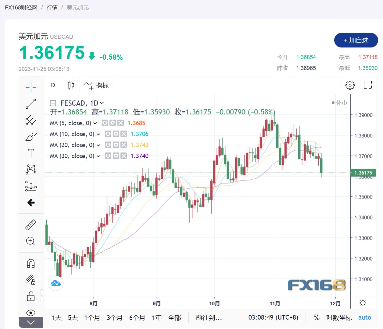 美元/加元汇率现报1.36175,跌幅0.58%,为本周最大跌幅。