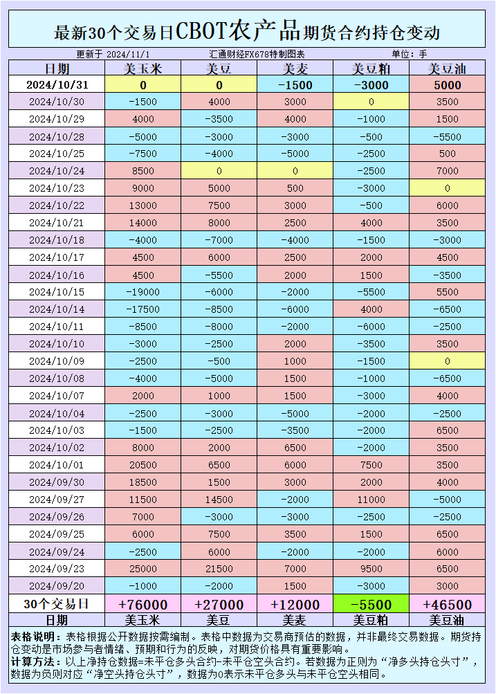 在CBOT玉米市场上,近期持仓数据显示投机性净空头增加。10月31日收盘价格每蒲式耳4.10-3/4美元,下跌0.75美分。尽管近30日数据显示投机性净多头增加,但短期的持仓数据表明市场偏空情绪上升,显示出对供应和需求不平衡的担忧。