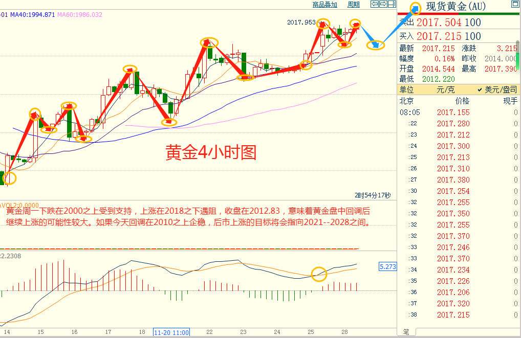 黄金周一下跌在2000.30之上受到支持,上涨在2018.00之下遇阻,意味着黄金短线下跌后有可能保持上涨的走势。如果黄金今天下跌在2010.00之上企稳,后市上涨的目标将会指向2021.00--2028.00之间。今天黄金短线阻力在2020.00--2021.00,短线重要阻力2027.00--2028.00。今天黄金短线支持在2010.00--2011.00,短线重要支持在2002.00--2003.00。