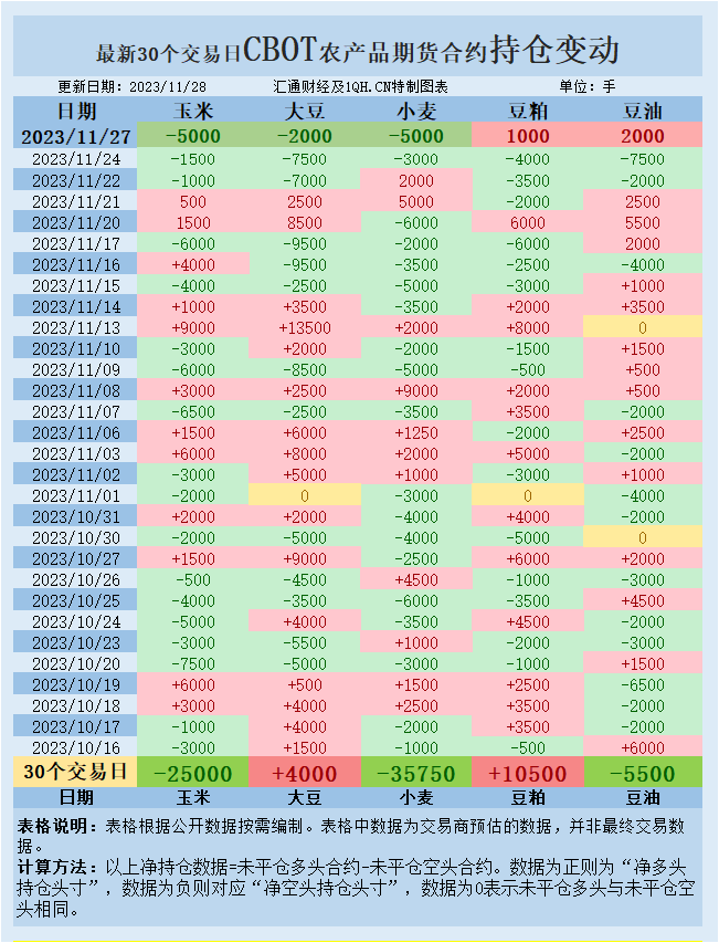 交易商预估的数据显示,大宗商品基金本周一(11月27日)增加玉米、大豆、小麦投机性净空头头寸,增加豆油、豆粕投机性净多头头寸。最近30个交易日,大宗商品基金本增加玉米、小麦、豆油投机性净空头头寸,增加豆粕、大豆投机性净多头头寸。