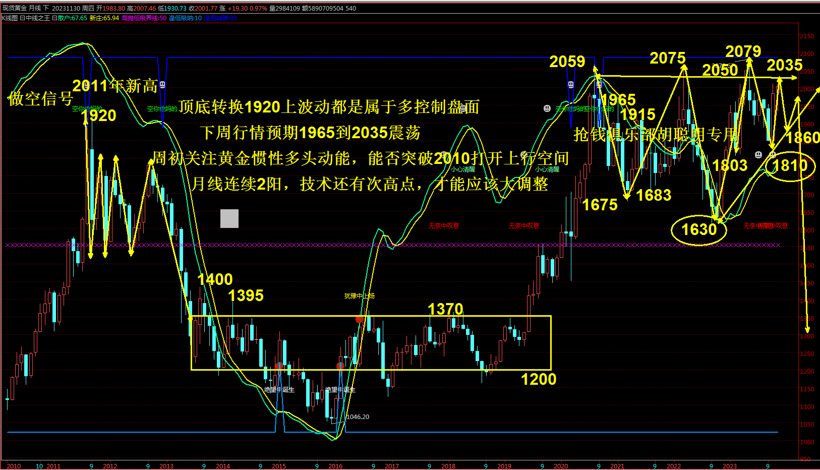 昨日黄金延续周五惯性上涨,最高触及2018位置,然后全天2005到2018区域横盘,如图目前压力集中2025和2035区域, 昨天黄金上涨,更多是为了洗盘周五隔夜做空博弈双顶2010的做空,经过昨天突然拉升基本洗完做空,技术看月线大阳以后惯性新高已经出现,那么上面多少空间不去猜测,反正把握一点不去2025上追多,即使看多也不去追多,除非高位回落20美金以上再说,熟悉盘面都是清楚前期1940到1985区域横盘整理一个月才是破位,那么顶底转换上轨1985就是做多防守位置,上涨你看似强势也许涨了两天,下跌不到30分钟跌回原形,下楼总比上楼快,一周五天交易昨日的2005应该不是本周最低价格,历史不会简单重复必有惊人相似,黄金在2035上就没有出现连续三天站稳的时候,同时美元距离支撑102.3也不过百点,按这样的反比幅度,那么黄金也就是20到30美金上涨空间随时调整,目前价格2015上20到30美金幅度,那就是2035到2050区域,但是我们巴以冲突的1835缺口依然还没有回补,俱乐现在将近200美金幅度的空间,这个时候我们可以从心态和动能博弈,上涨哪里不清楚,但是2015上没有200美金幅度涨幅,但是随时高位利空放大可以回补1835的缺口,所以不要去追多,而是出现高位回落参与,切记。综合上述操作思路如下: