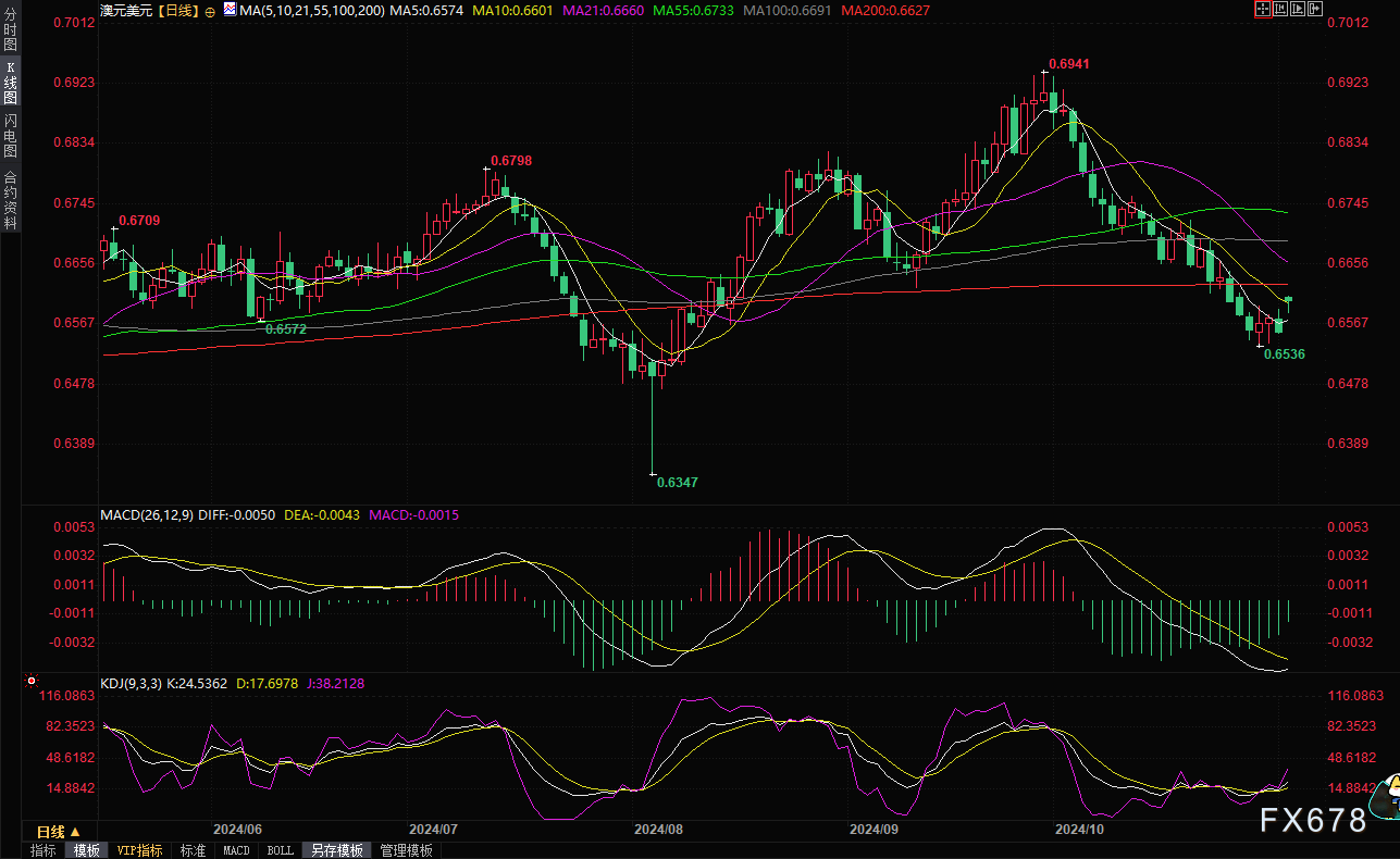 周一(11月4日)亚市早盘,澳元兑美元高开后守住涨幅,目前交投于0.6607附近,涨幅约0.76%,此前最高触及0.6609。美元维持盘初跌幅,目前美元指数跌幅扩大至0.62%,交投于103.68附近,接近上周五创下的近两周新低,这给非美货币提供支撑。