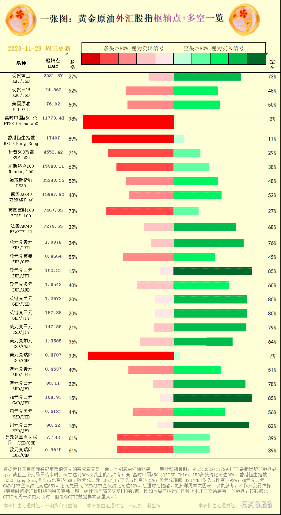 一张图:黄金原油外汇股指"枢纽点+多空占比"一览。今日(2023/11/29周三)最新出炉的数据显示,截止上个交易日结束时,头寸达到80%及以上的品种有:★ 富时中国A50 ☆FTSE China A50多头占比高达98%。香港恒生指数 HK50 Hang Seng多头占比高达89%。欧元兑日元 EUR/JPY空头占比高达85%。美元兑瑞郎 USD/CHF多头占比高达93%。加元兑日元 CAD/JPY空头占比高达85%。纽元兑日元 NZD/JPY空头占比高达82%。汇通财经提醒,更多详见本文图表。仅供参考,不作为交易依据。