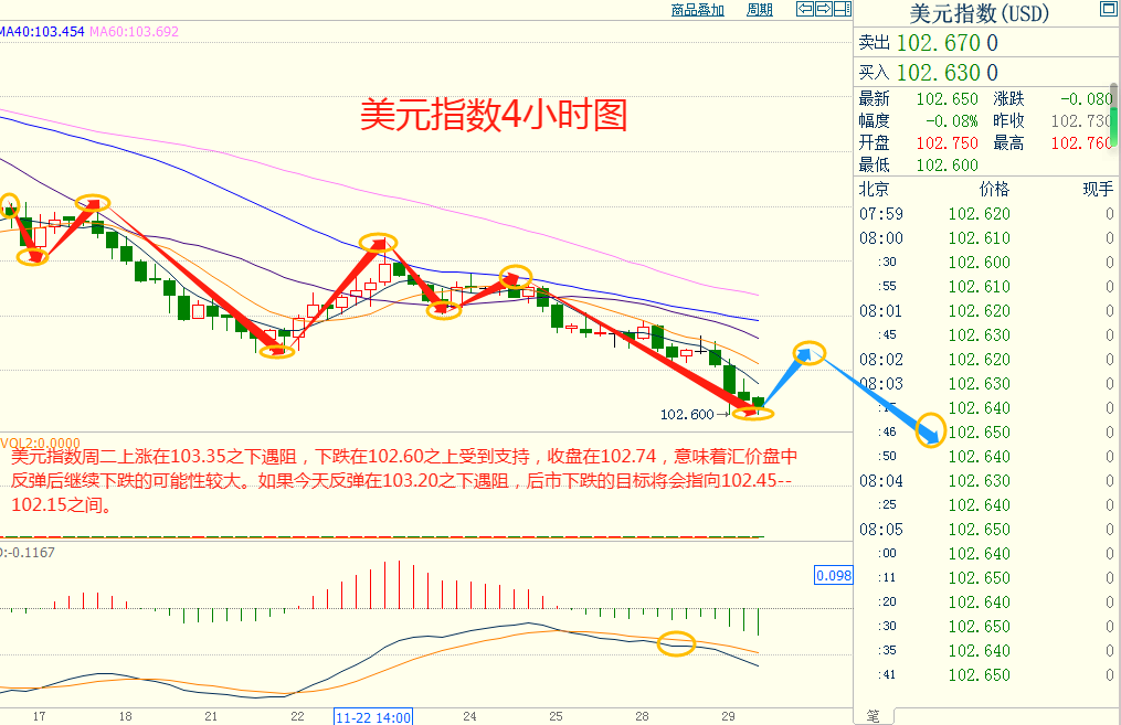 美指周二上涨在103.35之下遇阻,下跌在102.60之上受到支持,意味着美元短线上涨后有可能保持下跌的走势。如果美指今天上涨在103.20之下遇阻,后市下跌的目标将会指向102.45--102.15之间。今天美指短线阻力在102.90--102.95,短线重要阻力在103.15--103.20。今天美指短线支持在102.45--102.50,短线重要支持在102.15--102.20。