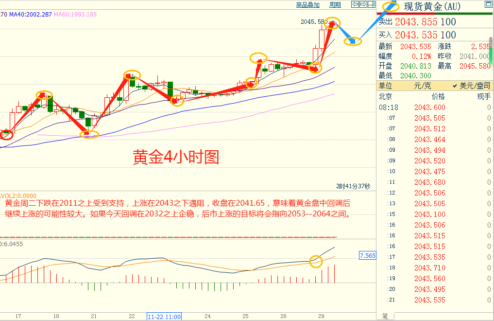 黄金周二下跌在2011.00之上受到支持,上涨在2043.00之下遇阻,意味着黄金短线下跌后有可能保持上涨的走势。如果黄金今天下跌在2021.00之上企稳,后市上涨的目标将会指向2053.00--2064.00之间。今天黄金短线阻力在2052.00--2053.00,短线重要阻力2063.00--2064.00。今天黄金短线支持在2032.00--2033.00,短线重要支持在2021.00--2022.00。