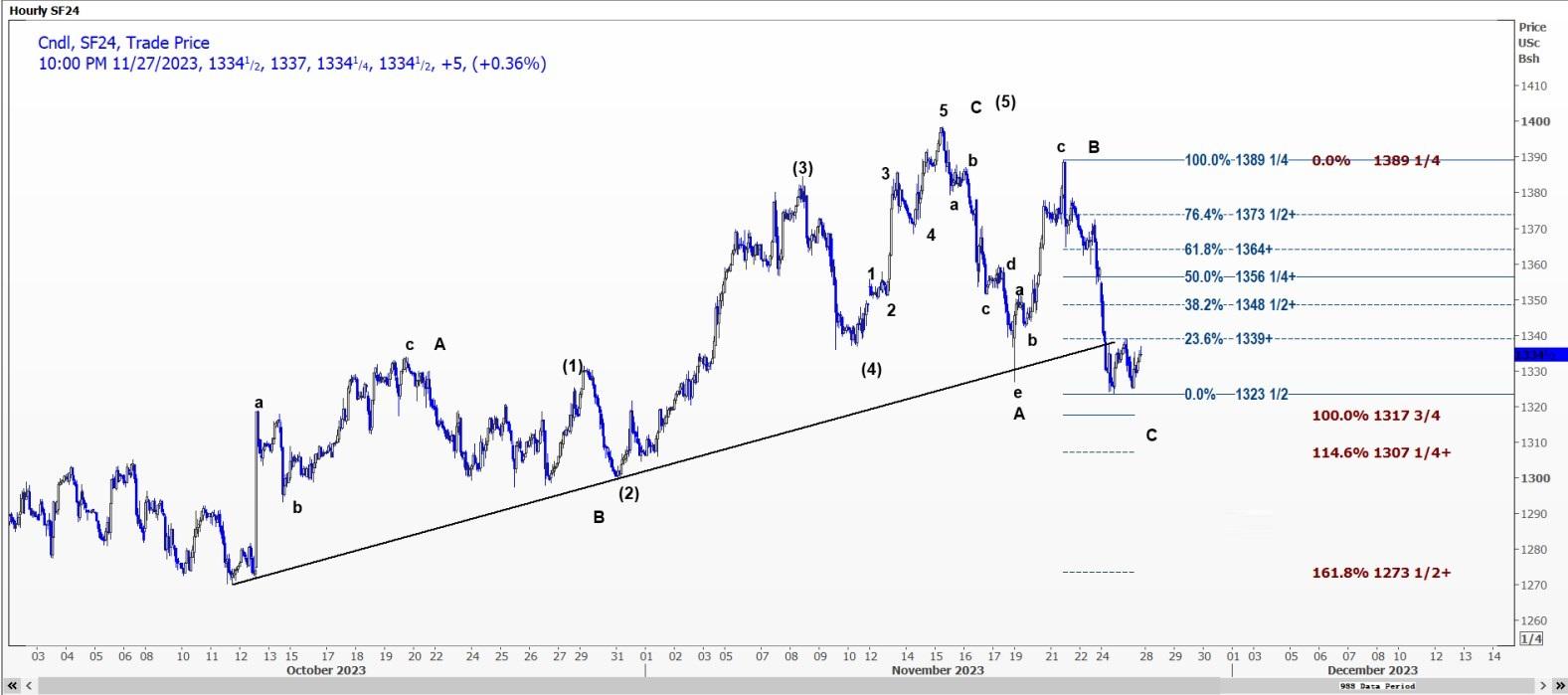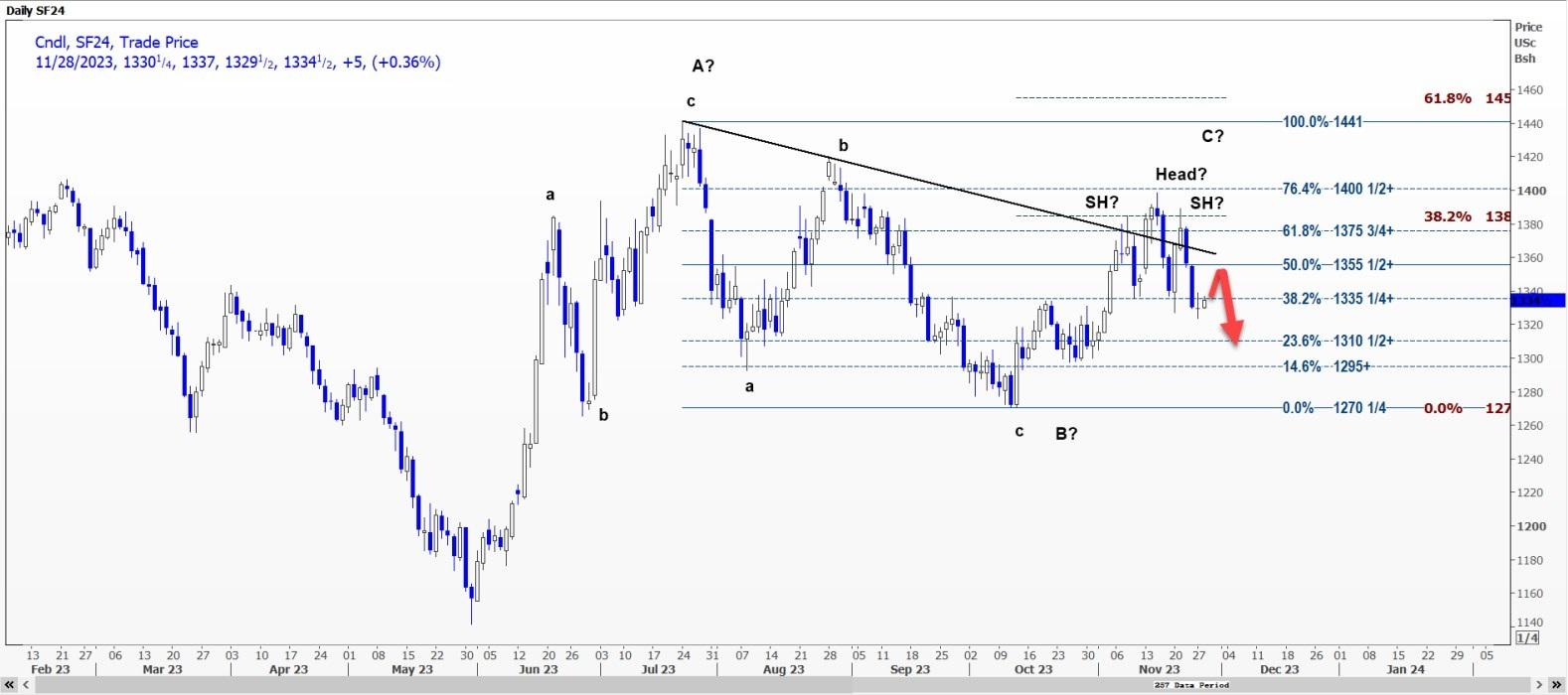 CBOT大豆1月合约SF24在每蒲式耳13.2350美元至13.39美元的范围内看起来中性,逃离可能暗示一个方向。