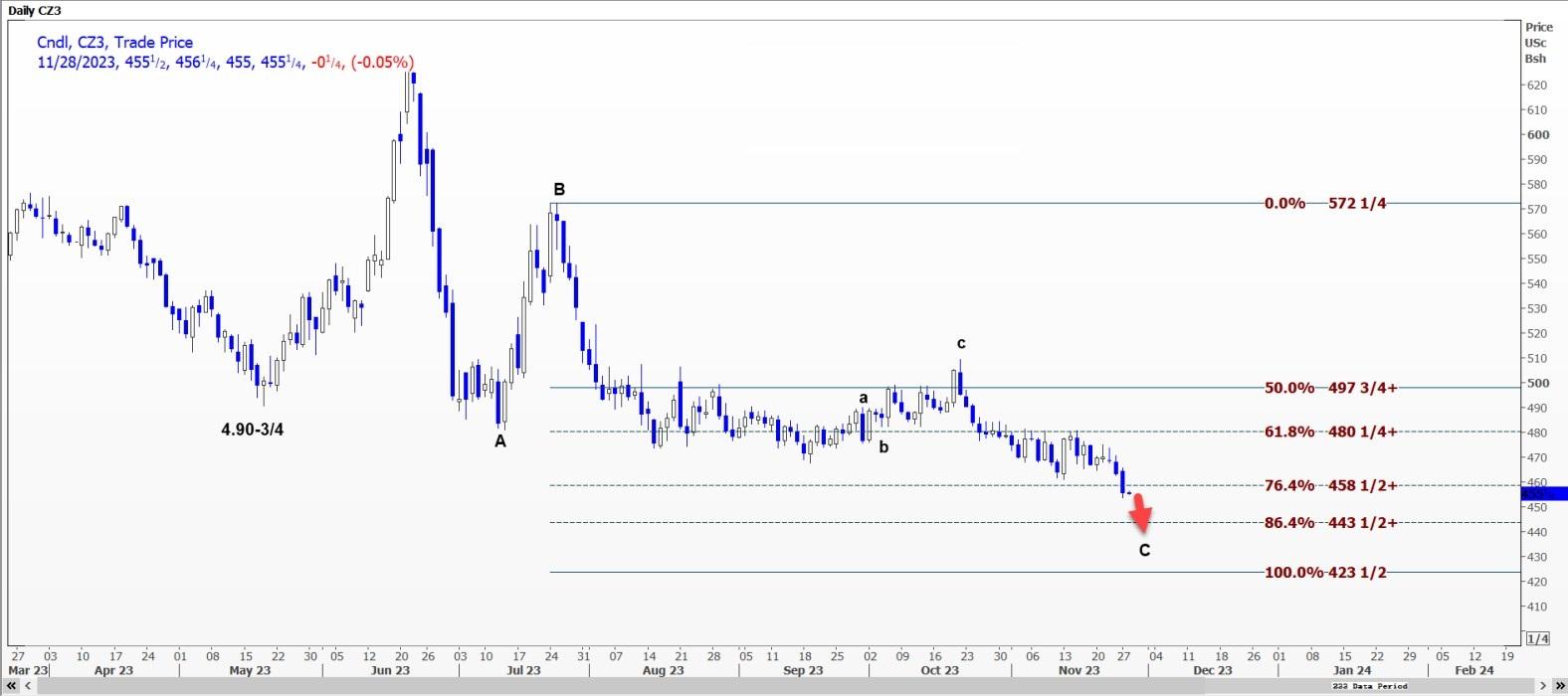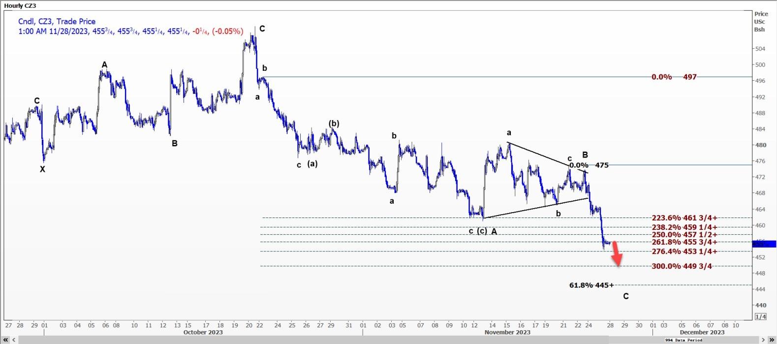 CBOT 12月玉米CZ3可能会重新测试每蒲式耳4.5325美元的支撑位,跌破该支撑位可能会打开通往4.4975美元的道路。