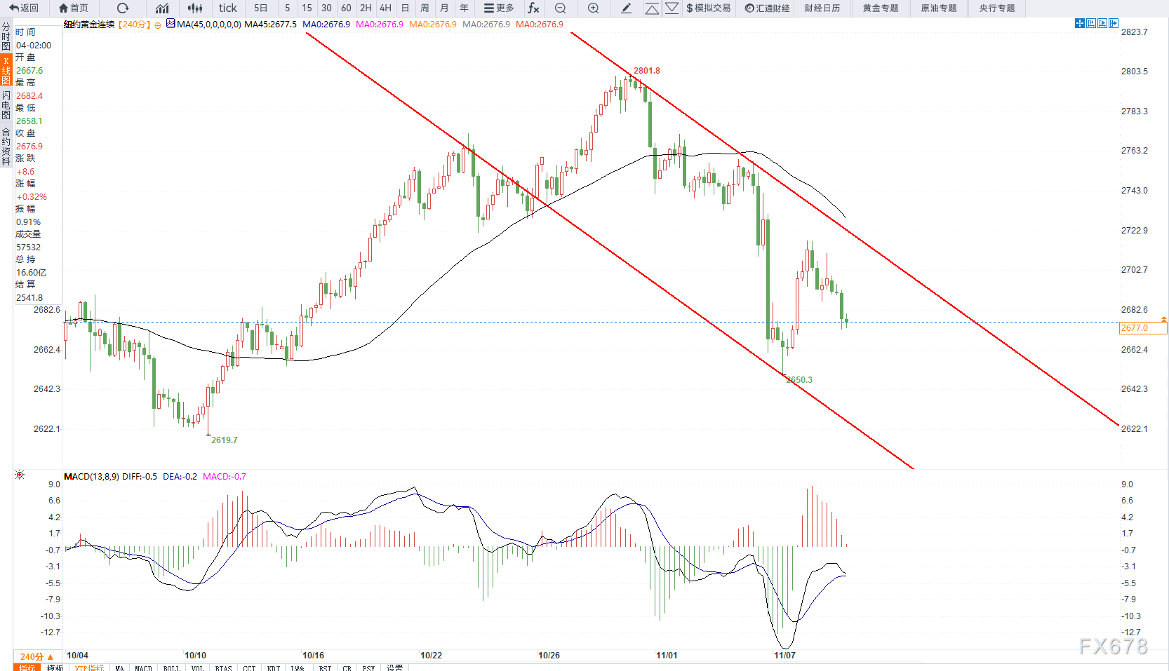 周一(11月11日)亚盘尾盘时段,COMEX黄金交投于2680.4美元附近,符合上周五前瞻,维持空头结构不变。