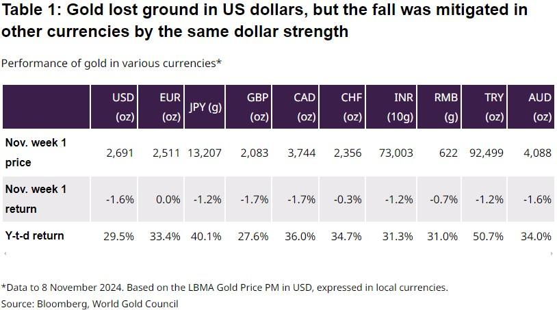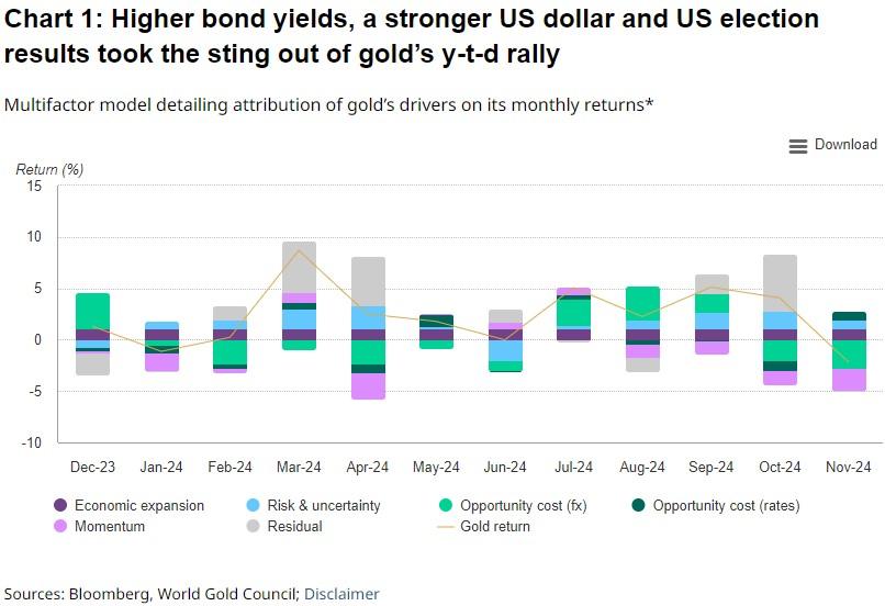 11月的第一周,黄金在创下新高后出现回调,世界黄金协会分析师在最新的评论中写道:“根据我们的黄金回报归因模型,黄金受到美元走强和滞后的金价表现、黄金ETF的资金流出,以及COMEX管理资金净多头的压力;这些迹象表明,投资者在美国大选前正在平仓以减少对冲头寸。”