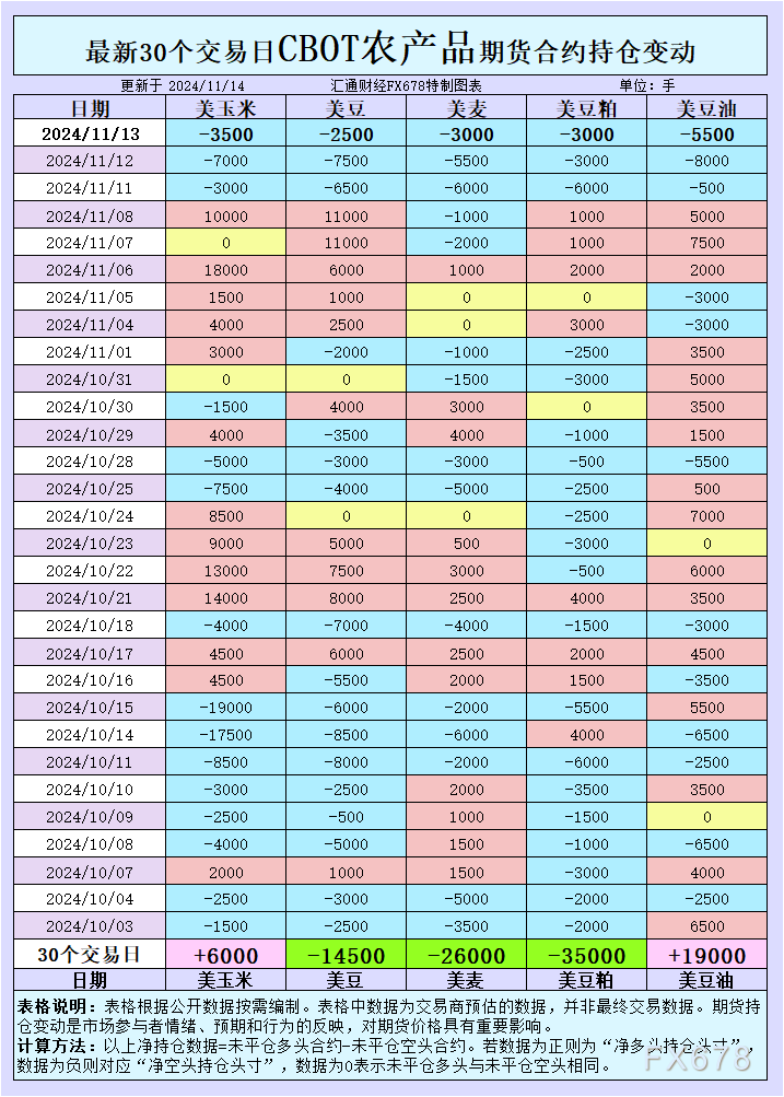 周四(11月14日),CBOT谷物市场出现明显波动,玉米和大豆空头增多,价格承压下行,反映出市场对需求疲软和全球供应增加的担忧;小麦则受限于全球库存高企,涨势受限。最新持仓数据显示,投机空头持续增仓,市场情绪趋向谨慎。随着北半球收割季的结束和南美播种进展,后续价格走势或将更加复杂,关注即将发布的美国农业部供需报告是否会带来新的市场驱动力。