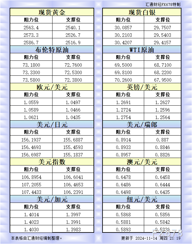 11月14日美市更新的黄金、白银、原油、美元指数、欧元、英镑、日元、瑞郎、澳元、加元、纽元支撑阻力位一览。