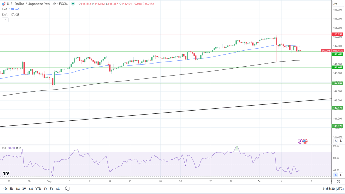 然而,跌破148.405支撑位将支持美元/日元朝200日均线移动。14-4小时RSI为38.80,表明美元/日元在进入超卖区域之前跌破148.405支撑位。