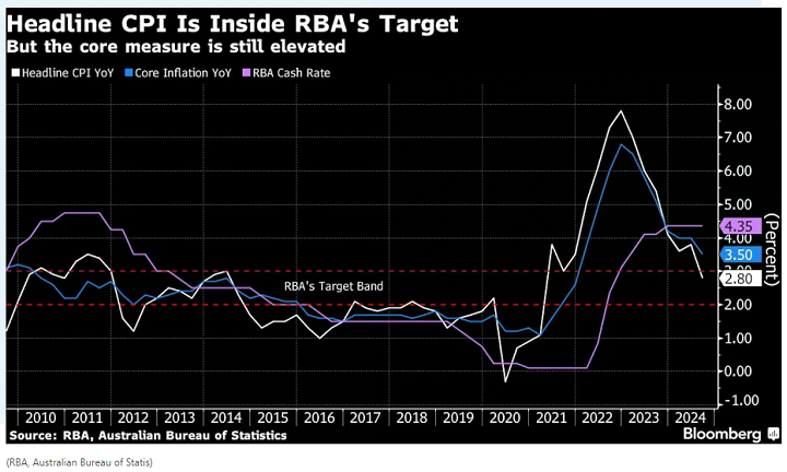 过去一年,澳洲联储一直将现金利率维持在4.35%的水平,试图控制消费者价格,同时保护劳动力市场,使经济实现软着陆。虽然通胀一直在降温(由于政府能源补贴,第三季度整体CPI大幅下降)但它仍然居高不下,核心价格要到2026年才能持续回到2% -3%的目标水平。