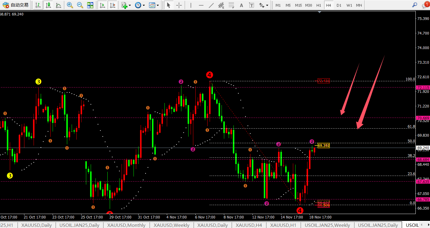 原油昨日我们也是最低位66.7-8进行的多单,同样收获利润。
