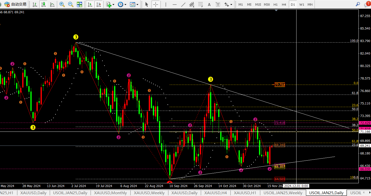 因此我们就需要寻找做多点位?昨日价格开盘从66.5-6一线震荡上行至67.25后再次回落至66.6一线反弹冲高,因此67.2-4是当前的支撑点。而日线均线MA5支撑68.27一线。