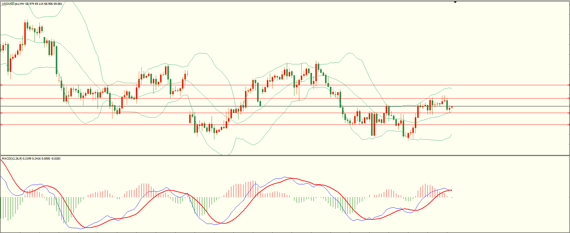 原油昨日反弹至第一阻力附近承压下行,至收盘回落至第一支撑展开反弹,日线报收上下影线小阴线,前阻力区犹存,短线的多空震荡继续,从4H来看,布林中轨偏上,MACD零轴上方运行,日内下方首要支撑68.50-60,第二支撑67.65,上方阻力69.60-70,70.65,保持在第一支撑上方短线有望回测第一阻力。