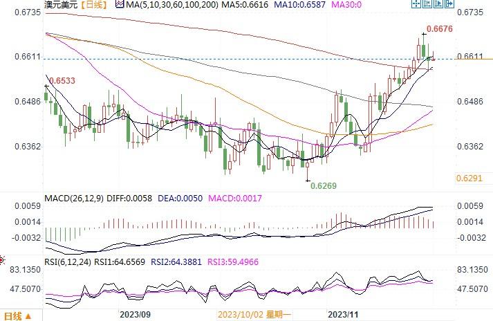 周四(11月30日),澳元/美元颇为震荡,当日最低曾去到0.6569,但收盘阶段有所拉升,最终收盘在0.6605水平。澳洲国内,周四的数据好坏参半,采矿业反弹推动澳洲第三季商业投资创下八年新高,建筑许可在10月份出现反弹,信贷供应的增长速度则有所放缓。而此前公布的10月份通胀不及预期,市场认为澳洲央行下周再次加息的可能性很小,明年加息的预期也有所下降。受上述市场因素影响,澳元近期的上升热潮有所减低。日内须关注的一项重要事件是鲍威尔的发言,要小心鲍威尔对市场预期不再升息的看法浇冷水,果真如此美元就有望继续反弹,澳元/美元恐会进入短线回落调整的走势。从日线图上观察,澳元/美元整体仍保持在上升轨道中,只是头部显得有点重,短线或面临回落调整的风险。但只要汇价保持在0.6500水平之上,澳元/美元后市仍有望继续攀高。