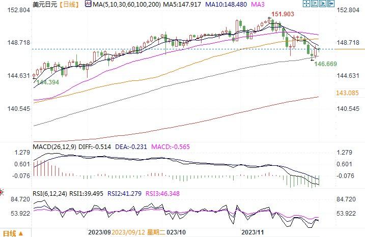 周四(11月30日),美元摆脱了显示美国通胀放缓迹象数据的影响勉强得到回升,当日美元/日元上涨0.6%,收盘在148.19。当日美国公布的个人消费支出(PCE)物价指数在9月份环比攀升0.4%后,10月份保持不变。10月PCE物价指数同比增长3.0%,为2021年3月以来的最小同比增幅,此前9月份的增幅为3.4%。虽然通胀情况继续显示有缓和,但缓和的幅度仍不大。因此,美元并未因此继续走弱。反而在月末交易员结清头寸的空头回补性交易扶持下,美元稍稍得到反弹喘息的机会。在日线图上,美元/日元已跌穿10、20、100日简单移动均线,各类技术指标仍处在下摆之中,没有显示转向的痕迹。且根据机构的观察,一年期远期掉期点继续收窄,11月30日达到781点,上回利差在类似水平时,美元/日元交投于137-139。后市只要该货币对持续受压于149.00之下,料美元/日元近期形成的下跌走势将会延续下去。