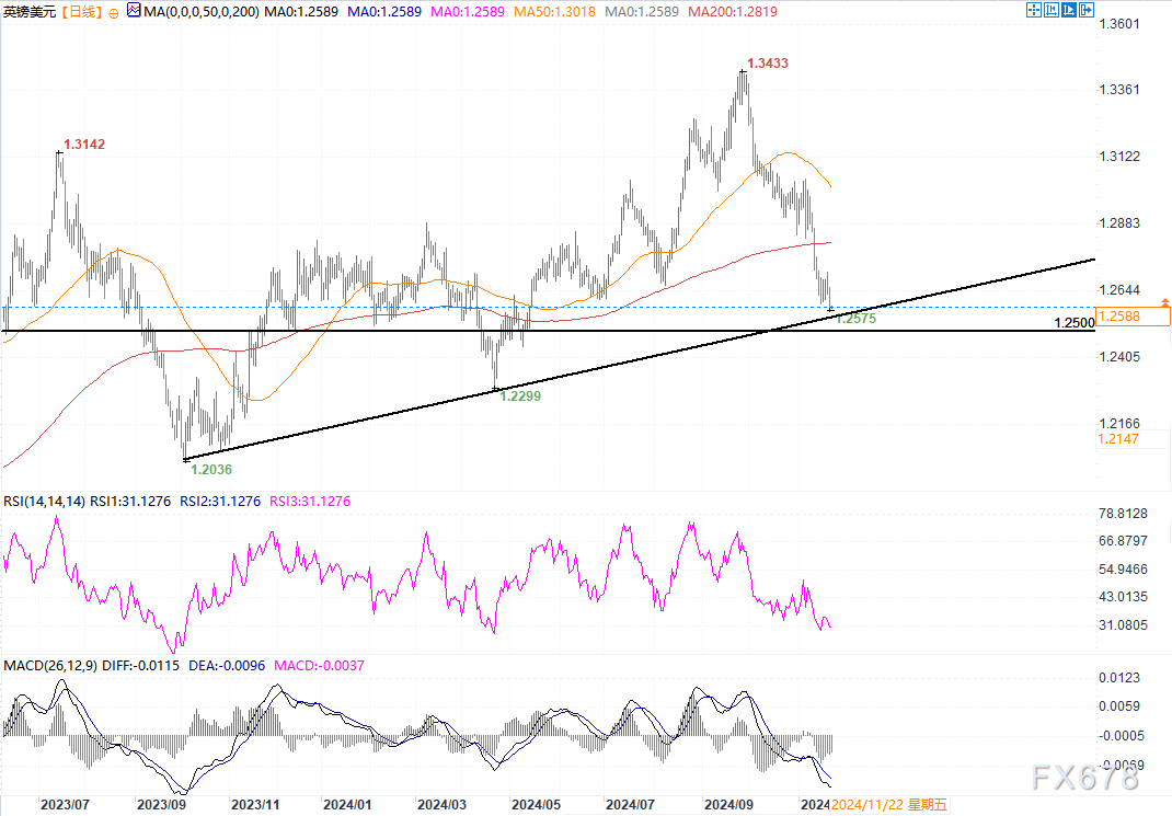 Razaqzada表示,支撑位预计在1.2580-1.2600区域,这一水平与2023年10月以来的趋势线相交。若跌破该趋势线,汇价可能会进一步下探至1.2500关口。