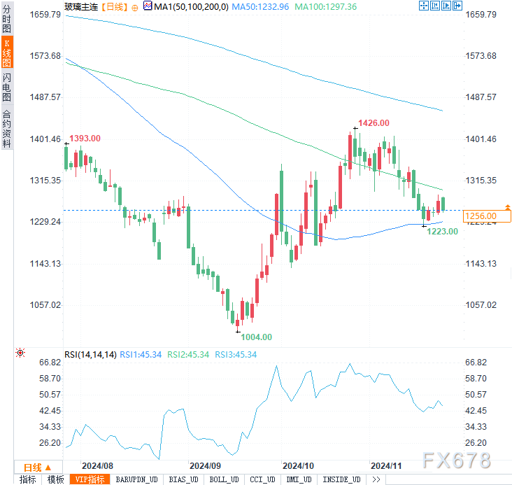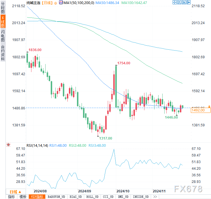 浮法玻璃市场整体弱势,11月21日均价为1391元/吨,环比下跌0.71%。从供需情况看,浮法玻璃日熔量维持在15.85万吨,而光伏玻璃产能环比减少1.32%。尽管库存下降一定程度缓解短期压力,但整体价格受需求疲软拖累。预计纯碱和玻璃短期内继续震荡运行。